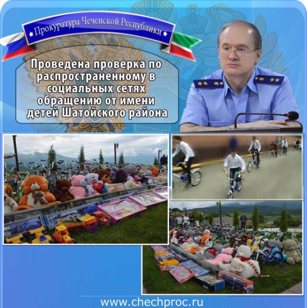Как сообщалось ранее, прокурором республики Шарпудди Абдул-Кадыровым организована проверка по распространённой в социальных сетях информации от лица группы детей Шатойского района к Главе Чечни Рамзану Кадырову, согласно которой у ребят, якобы были отобраны велосипеды, подаренные накануне руководителем региона.