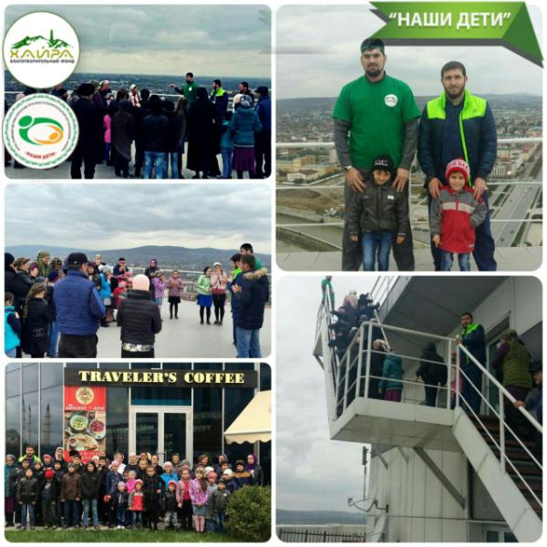 В программу вошли: поход в ресторан "Travellerscoffee" с 50% скидкой от владельца кофейни на весь заказ для детей-сирот, посещение смотровой площадки элитного комплекса Грозный-Сити, игровых зон в Гранд-Парке и мечети "Сердце Чечни".