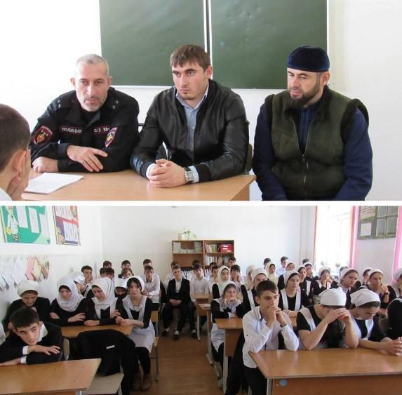 В гости к школьникам пришли имам села Беркат-Юрт Грозненского муниципального района Идрис Абакаев и сотрудники УНК МВД по ЧР, сообщается на официальной страница ДУМ ЧР в сети Инстаграм.