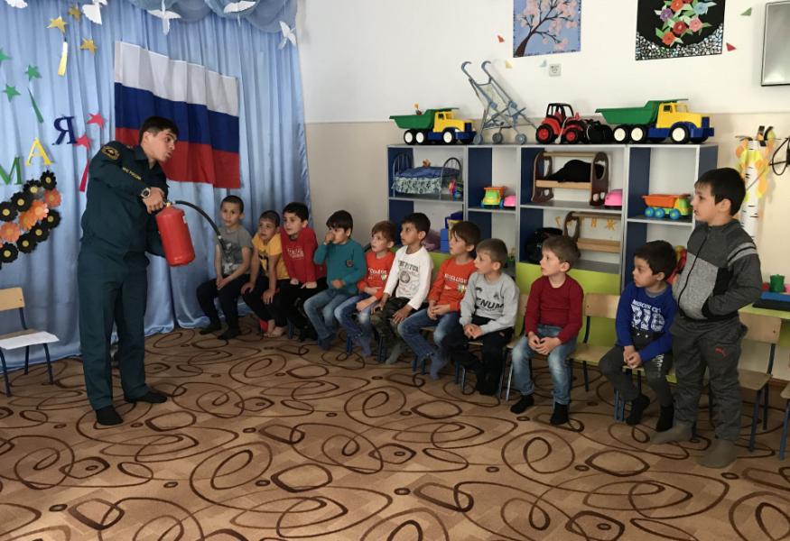 Занятие в детском саду «Солнышко» было построено в игровой форме, чтобы малыши лучше усвоили пока еще сложный для них материал. Сотрудники пожарно-спасательной части №31 по охране Грозненского района Чеченской Республики пришли в гости к дошколятам, вооружившись огнетушителем, пожарным стволом и элементами боевой одежды огнеборцев.