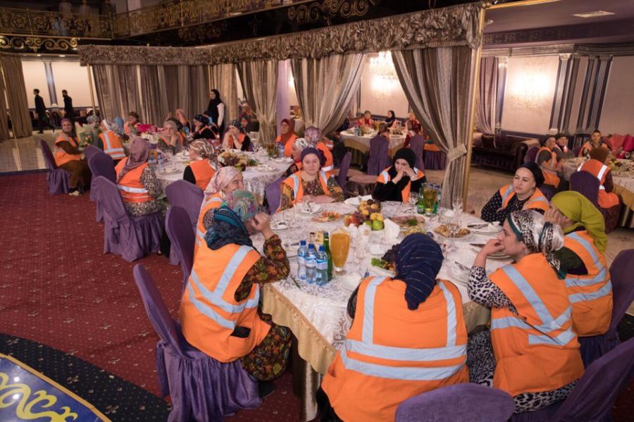 Президент Регионального общественного фонда имени Героя России Ахмата-Хаджи Кадырова Аймани Несиевна накрыла столы для большой группы онкобольных, страдающих ДЦП, рабочих Специализированного управления по ремонту и содержанию автодорог, санитарок медучреждений и нуждающихся жителей.