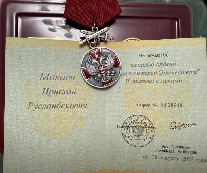 Военнослужащий 78-го мотострелкового полка "Север-АХМАТ" МО РФ, ефрейтор Ирисхан Макаев Указом Президента России награжден медалью ордена "За заслуги перед Отечеством" II степени с мечами. Об этом сообщили в пресс-службе подразделения.