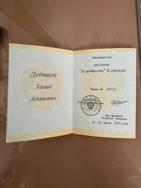 Военнослужащий 78-го мотострелкового полка "Север-АХМАТ" МО РФ, лейтенант Дешиев Халид Указом Президента Российской Федерации награжден медалью "За храбрость" II степени. Об этом сообщили в пресс-службе подразделения.