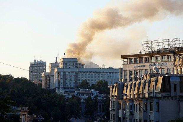 «Пожар в здании кабмина после прилета продолжается. По кадрам видно, что горит крыша либо верхний этаж», — говорится в публикации.